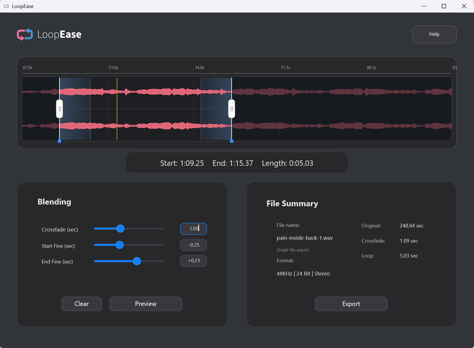 LoopEase is audio software designed to help users create smooth loopable audio in a few steps by trimming, crossfading, previewing, and exporting WAV or MP3 files. Primarily designed for musicians and audio engineers to create loops for keyboard patches or samplers, it can also be used as a standard audio editor. LoopEase imports and exports .wav and .mp3 files. It is compatible with Windows 11 only.